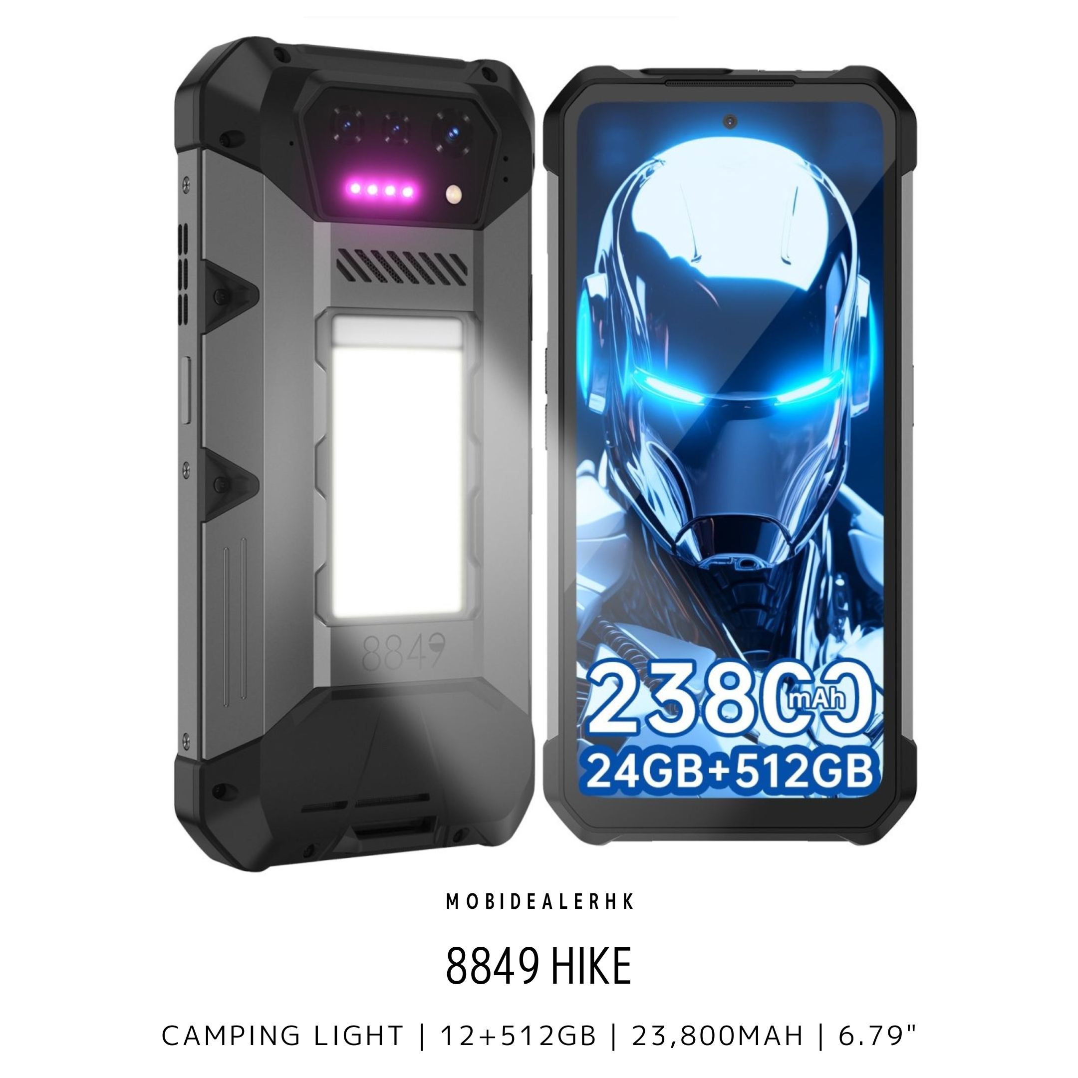 全新 New | 8849 Hike 三防手機 | 露營燈 | 12+512Gb | 23,800mAh | 反向充電 | 6.79" | NFC | 3咭槽 尺寸 Dimensions - 重量 Weight - 防水標準 Waterproof Standard IP68 | IP69K 防跌標準 Resistance Standard MIL-STD-810H 作業平台 Operating System Android 14 處理器 Processor MediaTek Helio G200 顯示屏 Display 6.79" | 1080 × 2460 更新率 Refresh rate | 120Hz RAM 12Gb 虛擬擴充RAM Virtual Expandable Capacity of RAM 12Gb 內存 Internal Storage 512Gb 外置記憶咭 External Memory 2Tb 前置相機 Front Camera 3,200萬像素 32MP 後置相機 Rear Camera 5,000萬像素主鏡頭 50MP Main Camera 800萬像素長焦鏡頭 8MP Telephoto Camera 6,400萬像素夜視鏡頭 64MP Night Vision Camera 指紋識別 Fingerprint 支援 Support NFC 支援 Support 電池 Battery 23,800mAh | 120W 反向充電 Reverse Charging 支援 Support 露營燈 Camping Light 支援 Support | 1200-Lumen 藍牙 Bluetooth 5.3 咭槽 Card Slots 3 顏色 Colour 黑 Black 包裝清單 In The Box 電源轉換器 Adapter USB Type-C 數據線 USB Type-C Cable