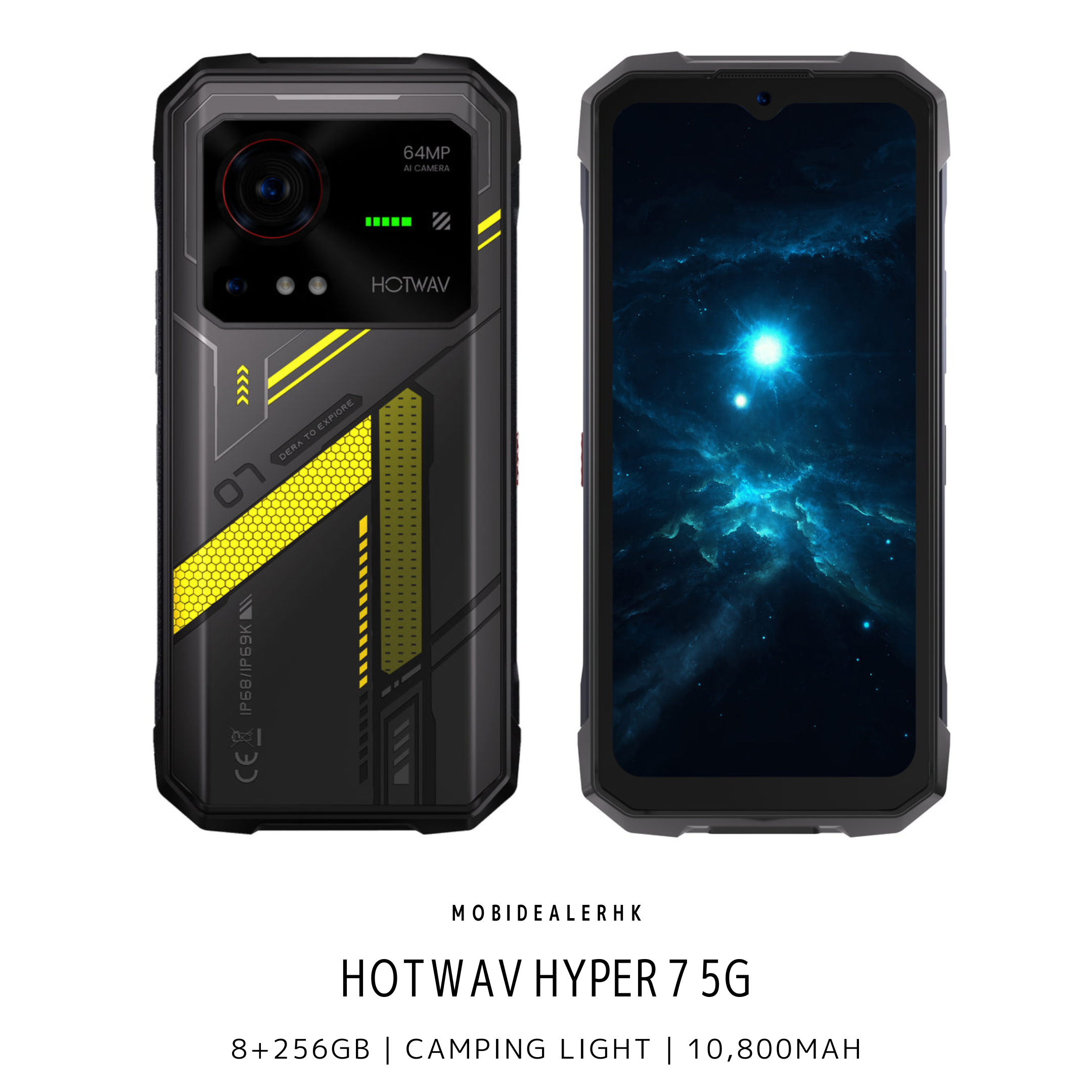 全新 New | Hotwav Hyper 7 5G 三防手機 | 8+256Gb | 露營燈 | 反向充電 | 10,800mAh | 33W 尺寸 Dimensions - 重量 Weight - 防水標準 Waterproof Standard IP68 | IP69K 防跌標準 Resistance Standard MIL-STD-810H 作業平台 Operating System Android 14 處理器 Processor MediaTek Dimensity 7050 顯示屏 Display 6.6" | 1080 × 2408 更新率 Refresh rate | 120Hz RAM 8Gb 虛擬擴充RAM Virtual Expandable Capacity of RAM 12Gb 內存 Internal Storage 256Gb 外置記憶咭 External Memory 2Tb 前置相機 Front Camera 3,200萬像素 32MP 後置相機 Rear Camera 6,400萬像素主鏡頭 64MP Main Camera 指紋識別 Fingerprint 支援 Support NFC 支援 Support 電池 Battery 10,800mAh | 33W 反向充電 Reverse Charging 支援 Support | 10W 露營燈 Camping 支援 Support Wi-Fi 6 顏色 Colour 黑 Black 黃 Yellow 包裝清單 In The Box 電源轉換器 Adapter USB Type-C 數據線 USB Type-C Cable 屏幕保護貼 Protective Film 快速入門指南 Quick Start Guide
