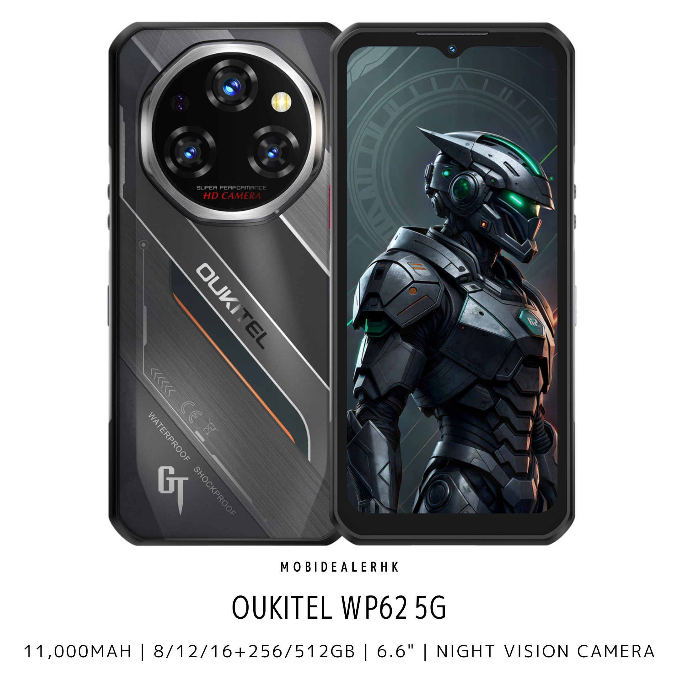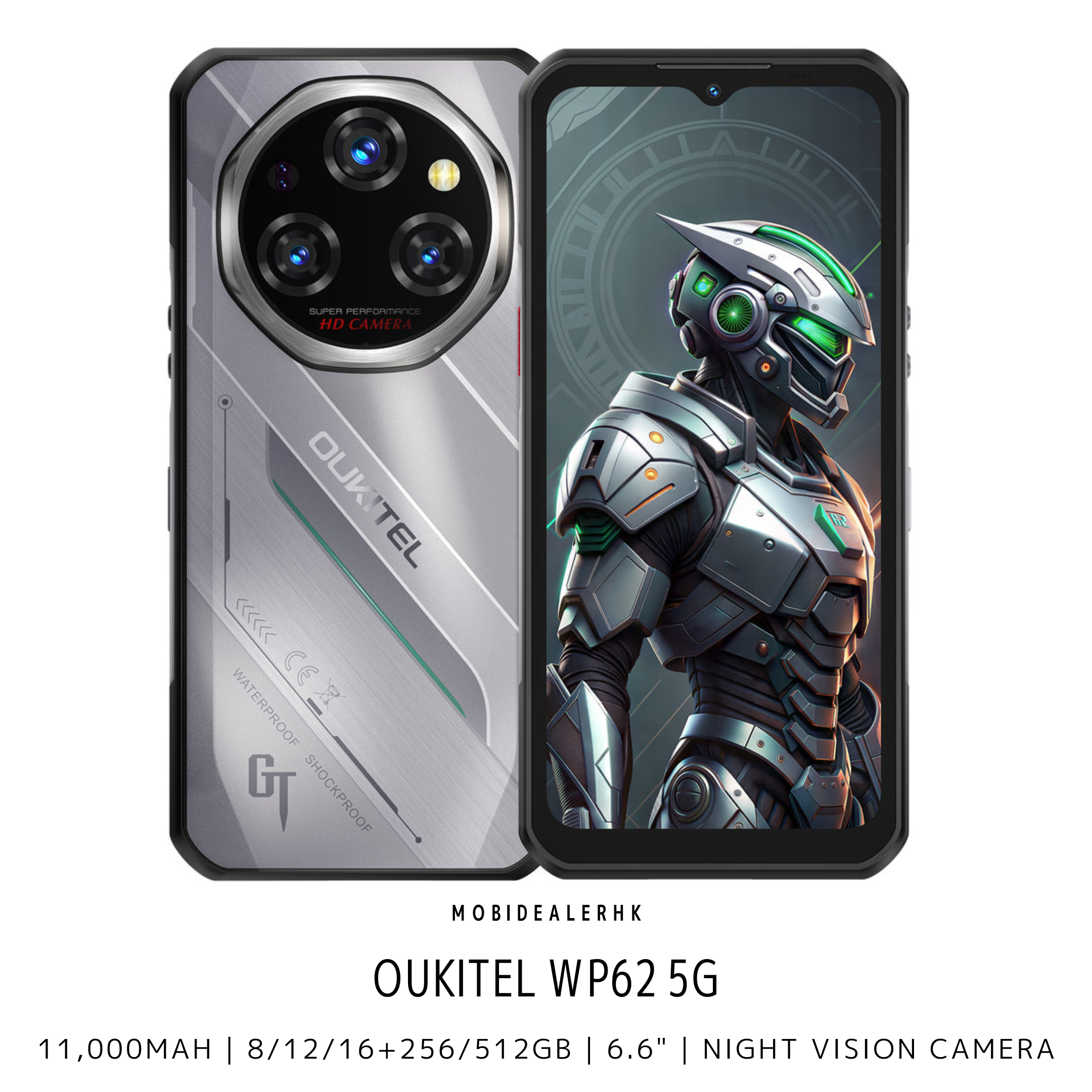 全新 New | Oukitel WP62 5G 三防手機 | 11,000mAh | 8/12/16+256/512Gb | 6.6" | 夜視鏡 | 反向充電 尺寸 Dimensions 172.2 x 81 x 15.8mm 重量 Weight 367.6g 防水標準 Waterproof Standard IP68 | IP69K 防跌標準 Resistance Standard MIL-STD-810H 作業平台 Operating System Android 15 處理器 Processor MediaTek Dimensity 7025 顯示屏 Display 6.6" | 1080 × 2408 更新率 Refresh rate | 120Hz RAM 8Gb 12Gb 16Gb 虛擬擴充RAM Virtual Expandable Capacity of RAM 16Gb 24Gb 32Gb 內存 Internal Storage 256Gb 512Gb 外置記憶咭 External Memory 2Tb 前置相機 Front Camera 3,200萬像素 32MP | F2.2 | 78° 後置相機 Rear Camera 1.08億像素主鏡頭 108MP Main Camera | F1.9 | 79° 800萬像素夜視鏡頭 8MP Night Vision Camera | F2.2 | 78° 200萬像素微距鏡頭 2MP Macro Camera | F2.2 | 76° 指紋識別 Fingerprint 支援 Support NFC 支援 Support 電池 Battery 11,000mAh | 33W 反向充電 Reverse Charging 支援 Support | 7.5W 藍牙 Bluetooth 5.2 顏色 Colour 黑 Black 銀 Silver 包裝清單 In The Box 電源轉換器 Adapter 屏幕保護貼 Protective Film USB Type-C 數據線 USB Type-C Cable 快速入門指南和保養卡 Quick Start Guide and Warranty Card