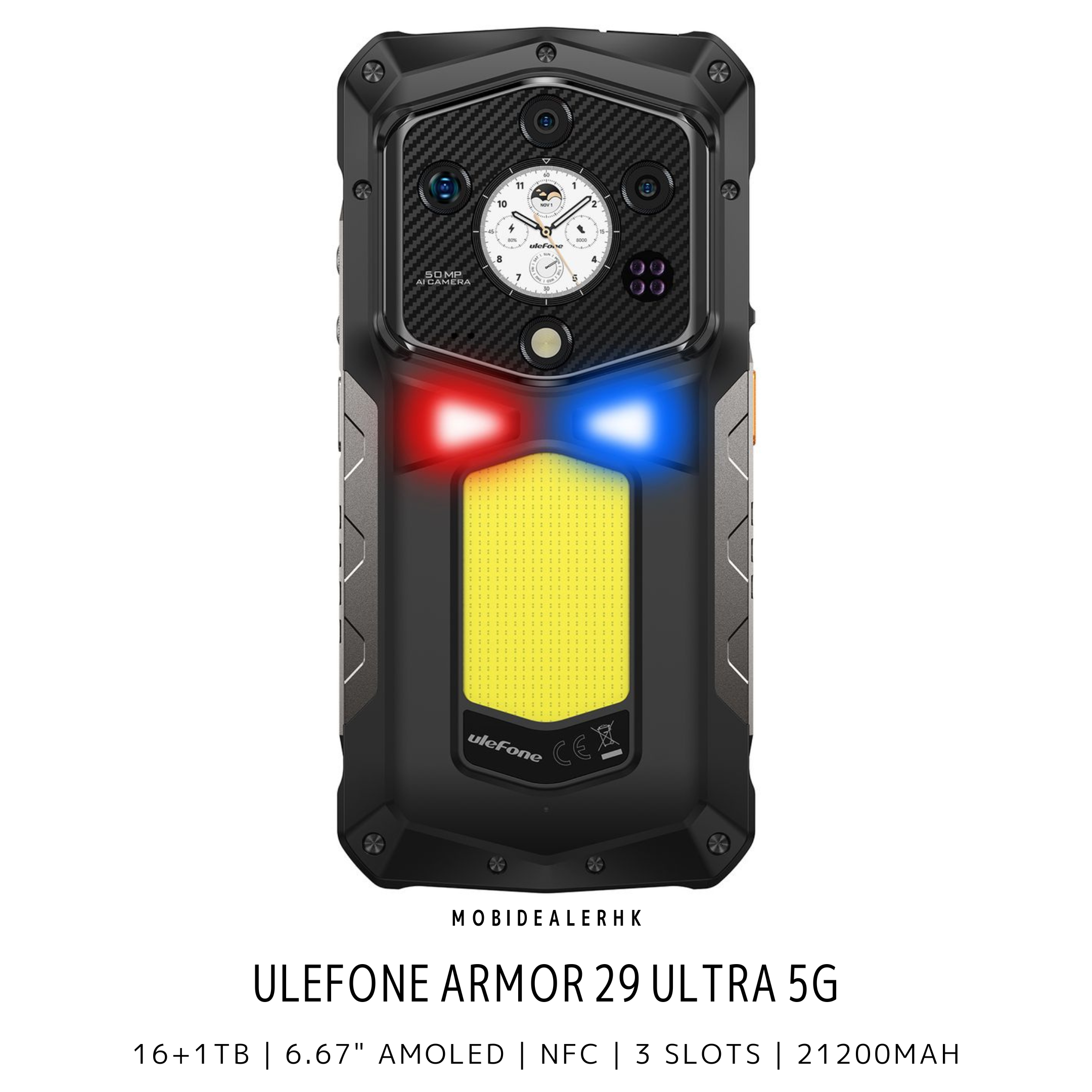 採用優惠碼[UAA29U]即減$909 Use the promotion code [UAA29U] to get $909 discount 全新 New | Ulefone Armor 29 Ultra 5G 三防手機 | 歐樂風 Armor 29 Ultra 5G 三防手機 | 16+1Tb | 6.67" AMOLED | NFC | 3咭槽 | 21200mAh | 反向充電 尺寸 Dimensions 177.35 x 85.6 x 33.8mm 重量 Weight 688g 防水標準 Waterproof Standard IP68 | IP69K 防跌標準 Resistance Standard MIL-STD-810H 作業平台 Operating System Android 15 處理器 Processor MediaTek Dimensity 9300+ 顯示屏 Display 6.67" | 1080 × 2400 | AMOLED 更新率 Refresh rate | 120Hz 後置顯示屏 Rear Display 1.04" | 340 x 340 RAM 16Gb 虛擬擴充RAM | Virtual Expandable Capacity of RAM 16Gb 內存 Internal Storage 1Tb 外置記憶咭 External Memory 2Tb 前置相機 Front Camera 5,000萬像素 50MP | F2.45 | 80.4° 後置相機 Rear Camera 5,000萬像素主鏡頭 50MP Main Camera | F1.9 | 85.1° 5,000萬像素超廣角鏡頭 50MP Ultra Wide-angle Camera | F2.2 | 117.3° 6,400萬像素夜視鏡頭 64MP Night Vision Camera | F1.79 | 79.4° 指紋識別 Fingerprint 支援 Support NFC 支援 Support 電池 Battery 21,200mAh | 120W 反向充電 Reverse Charging 支援 Support | 10W 喇叭 Speaker 118dB 多功能燈 Versatile Light 1000-Lumen Wi-Fi 7 藍牙 Bluetooth 5.4 3.5mm接口 3.5mm Jack 支援 Support 咭槽 Card Slots 3 | SIM + SIM + Memory Card 顏色 Colour 黑 Black 包裝清單 In The Box 電源轉換器 Adapter USB Type-C 數據線 USB Type-C Cable 掛繩 Lanyard 屏幕保護貼 Protector Film SIM 卡彈出工具 SIM Eject Tool 快速入門指南和保養卡 Quick Start Guide and Warranty Card 可加配配件 Additional Compatible Accessories 通用戰術手機袋 Ulefone Armor Molle Holster 顯微鏡 Ulefone uSmart C01 內窺鏡 Ulefone uSmart E02 轉動式內窺鏡 Ulefone uSmart E03