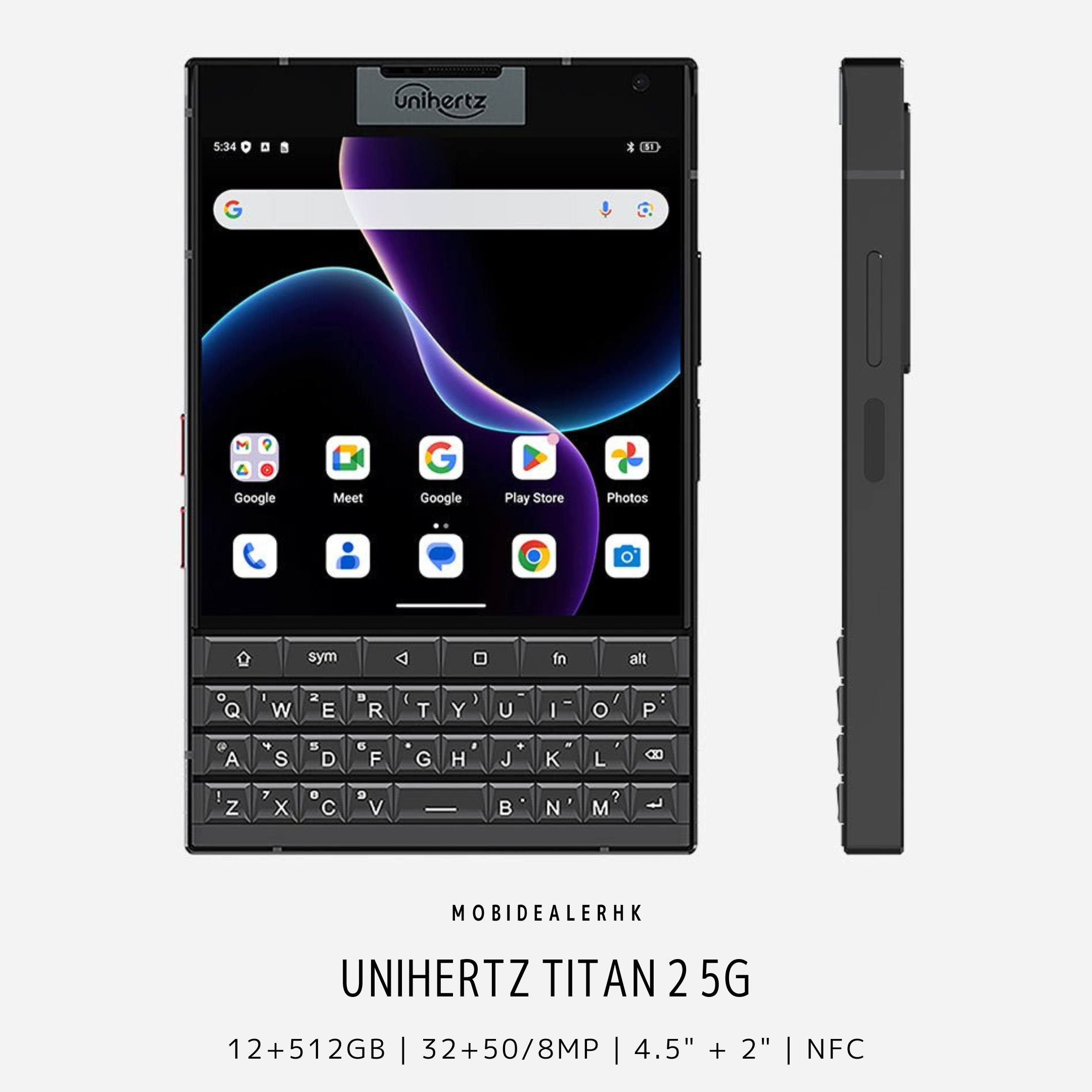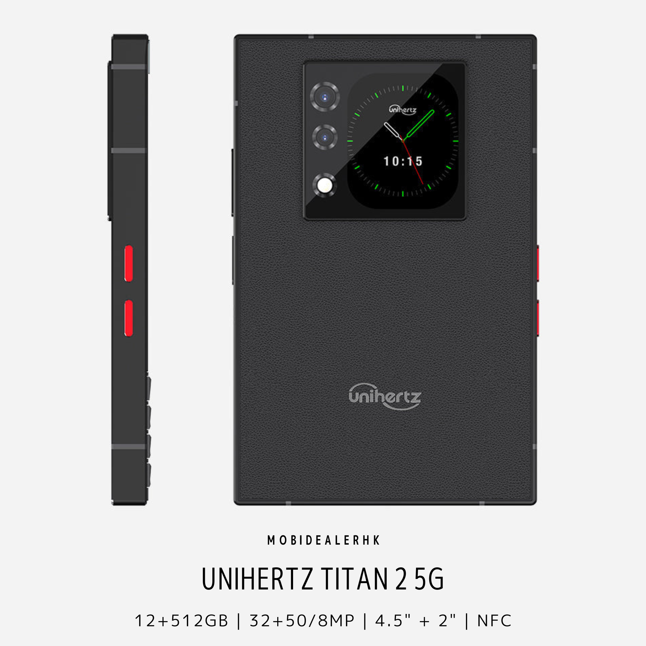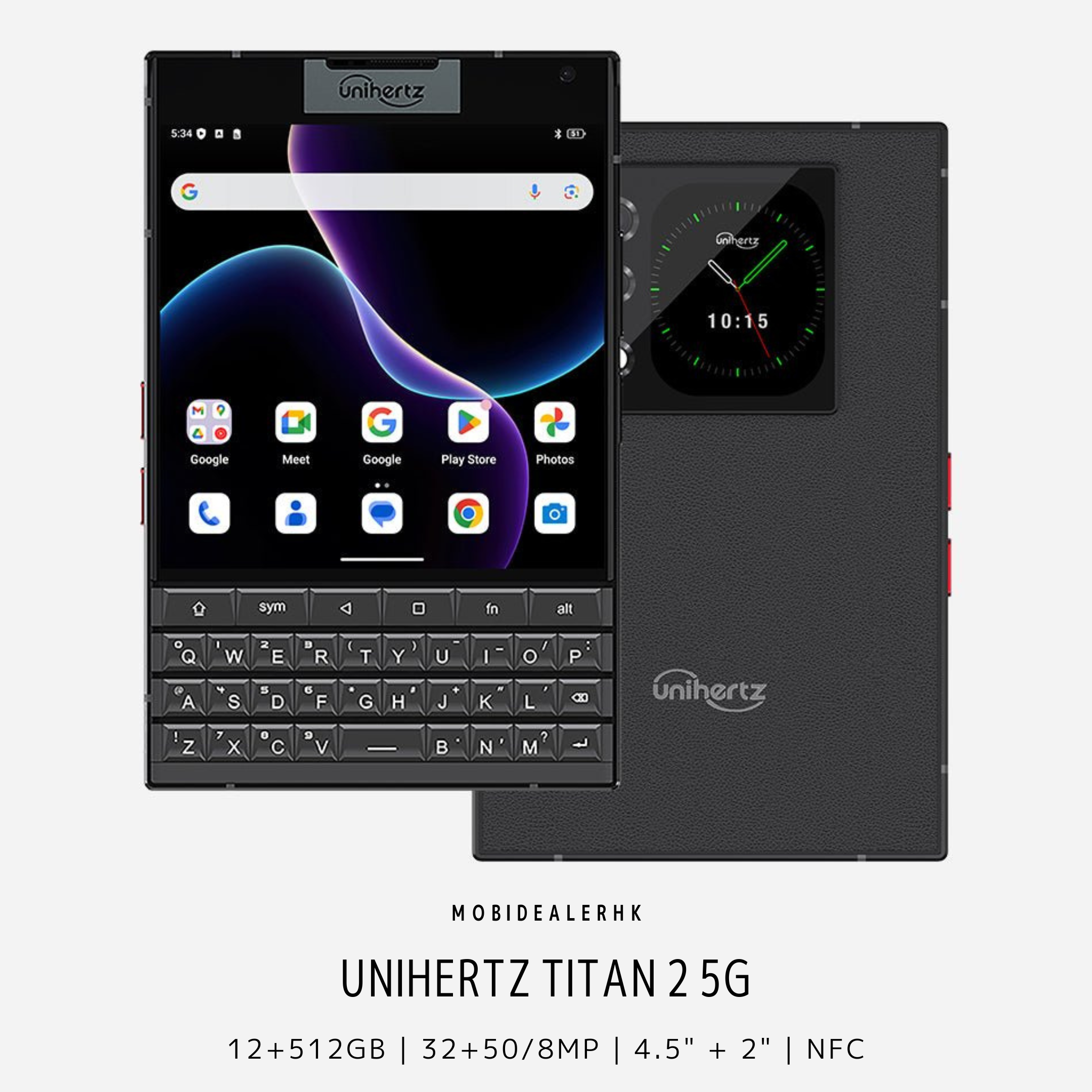 全新 New | Unihertz Titan 2 5G | 12+512Gb | 32+50/8MP | 4.5" + 2" | NFC 尺寸 Dimensions 137.8 x 88.7 x 10.8mm 重量 Weight 235g 作業平台 Operating System Android 15 處理器 Processor MediaTek Dimensity 7300 主顯示屏 Main Display 4.5" | 1440 x 1440 副顯示屏 Second Display 2.2" | 410 x 502 RAM 12Gb 虛擬擴充RAM | Virtual Expandable Capacity of RAM - 內存 Internal Storage 512Gb 外置記憶咭 External Memory - 前置相機 Front Camera 3,200萬像素 32MP 後置相機 Rear Camera 5,000萬像素主鏡頭 50MP Main Camera | F1.8 | OIS 800萬像素長焦鏡頭 8MP Telephoto Camera | F2.2 指紋識別 Fingerprint 支援 Support 電池 Battery 5,050mAh | 33W NFC 支援 Support 藍牙 Bluetooth 5.4 顏色 Colour 黑 Black 包裝清單 In The Box 電源轉換器 Adapter USB 數據線 USB Cable 屏幕保護貼 Protective Film SIM 卡彈出工具 SIM Eject Tool 保護套 Case 快速指南及保養卡 Quick Start Guide & Warranty Card